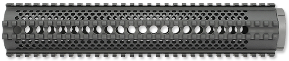 LIGHTWEIGHT DESIGN. MIL-SPEC HARD COAT ANODIZED 6061 ALUMINUM. COMPLETE WITH ALL NECESSARY MOUNTING HARDWARE. INSTALLATION REQUIRES SOME GUNSMITHING. INCLUDES THREE LADDER RAIL COVERS, SEVEN SLOT. LENGTH 12 INCHES, WEIGHT: 20 OUNCES.